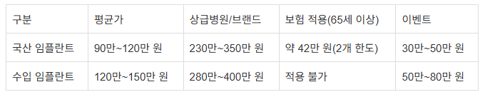 국산 임플란트와 수입 임플란트의 가격을 비교해 놓은 표입니다.